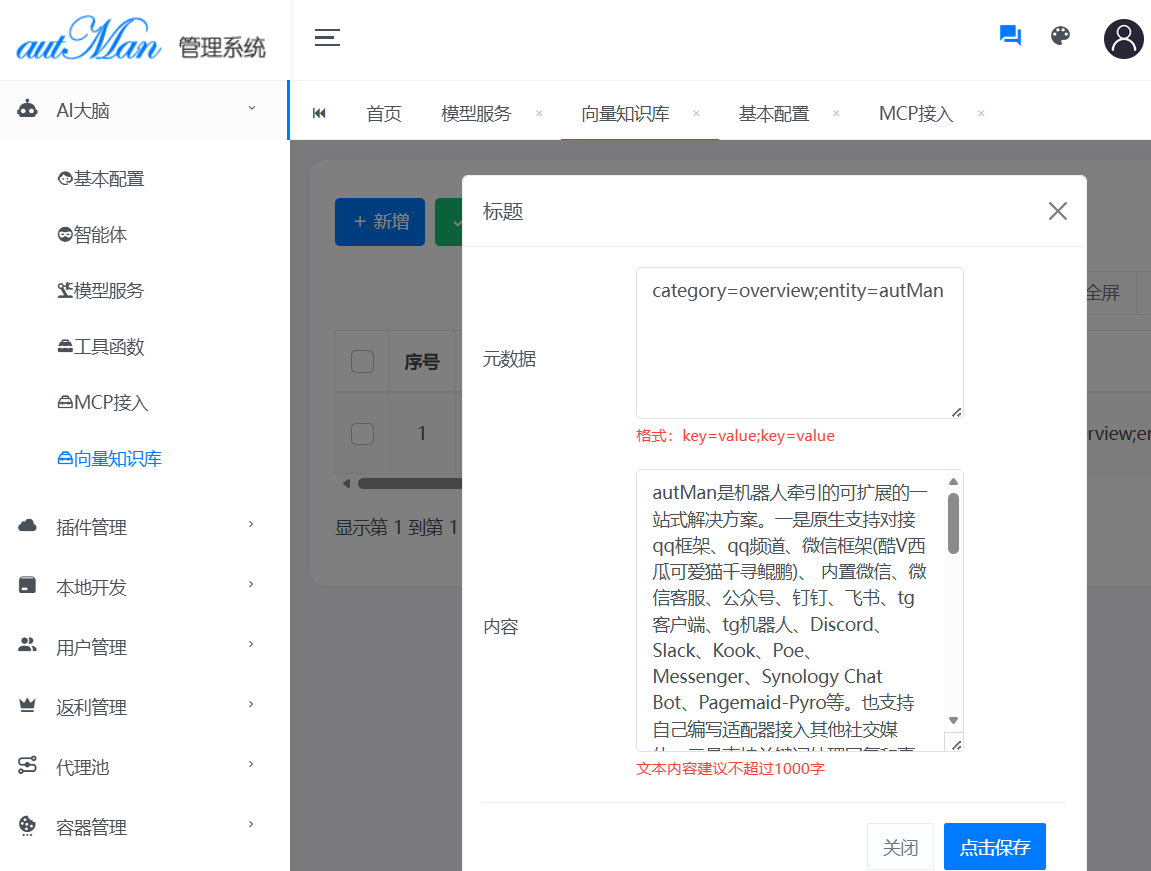 内容:长文本,后期会支持上传文件,例如:autMan是机器人牵引的可扩展的一站式解决方案。一是原生支持对接qq框架、qq频道、微信框架(酷V西瓜可爱猫千寻鲲鹏)、 内置微信、微信客服、公众号、钉钉、飞书、tg客户端、tg机器人、Discord、Slack、Kook、Poe、Messenger、Synology Chat Bot、Pagemaid-Pyro等。也支持自己编写适配器接入其他社交媒体。二是支持关键词处理回复和事件处理操作,支持SSE连接,实时监听所有对接IM的消息。具备日志实时显示功能,方便调试。三是支持多语言插件,如html、ECMAScript5、nodejs、typescript、python3、php、shell、golang等,不仅限这些编程语言,内置了插件市场,即装即用。四是内置脚本运行容器,支持python3、javascript、shell、typescript 等多种语言脚本的定时任务管理,支持虚拟多容器,同时支持单脚本不同变量的并发和同变量分组并发,也支持对接青龙面板并进行管理。五是内置全可视化代理池,维护可用代理,支持代理源自动休眠。支持隧道代理服务和API获取代理IP服务。六是支持京东、淘宝、拼多多、外卖等返利(查询当前价格,历史价格,平台比价)支持二维码扫码购买,收益查询。七是支持用户管理。八是支持自定义路由路径的微服务,即自定义路由,并自行编写处理逻辑。九是完善的API开放接口,可将autMan集成到自己的系统中。